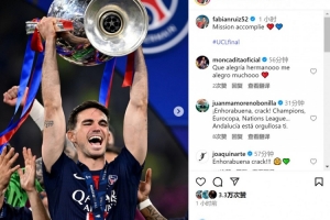 体育资讯6月1日讯 欧冠决赛,法比安-鲁伊斯首发出战,帮助巴黎5-0国米,捧起冠军奖杯。